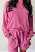 Strawberry Pink Ribbed Plain Drawstring Shorts Set